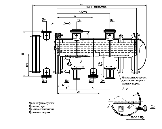 Конденсаторы вертикальные с диаметром кожуха 600-1200 мм выполняются со смещенным трубным пучком, с диаметром кожуха 1400-2000мм – с расширением кожуха в зоне входа пара.